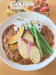 チキントマトカレー秋野菜のトッピング ゴールデンカレーとトマト水煮缶で作ったチキンカレーに豆と穀物のご飯・かぼちゃ・さつまいも・いんげんを添えました! カレーのスパイシーな辛さと野菜の素朴な甘みがぴったりマッチして美味しかったです♪