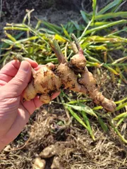 家庭菜園で生姜を収穫しました!トマトなどいろんな野菜が側で栽培したからか小さめになってしまいました。