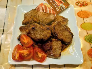 ステーキ肉(もも)と大人気のシーズニングジャークチキンを使って、ジャークポークを作りました。 フォークとナイフで肉をカットするところが楽しいです。ポークでもスパイスが染みて美味しいですよ~。