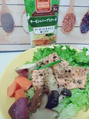 💠サーモンのハーブステーキ🐟️ 最近乾燥気味だから…お肌がアスタキサンチンを補給して〰️‼️と言っているように思い美味しそうな脂の乗ったサーモンの切り身を見つけ購入しました♪ さつまいもとサーモンのクリームシチューを作ろう‼️〜と思ってゴソゴソ探していたら…?そう言えばシーズニン