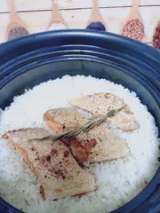 💠ローズマリーとサーモンの炊き込みご飯 💠ローズマリーとサーモンの土鍋で炊き込みご飯 脂の乗ったサーモンをローズマリー、タラゴン、セージ、ブラックペッパー、ガーリックグラニュール、塩、ホワイトワインを振りかけて焼く【写真📷️4枚目】研いだ2合の米に水420ccと昆布パウダー、帆立パウダーを土鍋に入れる。焼いたサーモン