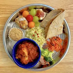 ターメリック香るチキンカレー ターメリックのまろやかな香りときれいな黄色の仕上がりを楽しめるカレーです。大好きなマッシュルームは少し多めに入れました♪左から岩手町ブルーベリーカレー(レトルト)、ダル、ケールのサラダとシークワーサーのラッシー。チャパティは前回より少しまともに焼けた…かな?
