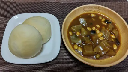 お豆蒟蒻カレーその② お豆ゴロゴロ蒟蒻カレー。最近これですこぶる調子が良いので再登場。今日は米粉パンで頂きます。赤缶パウダールウ+ディナーカレーフレークって最高!