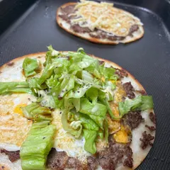 トルティーヤタコス ①トルティーヤにチリパウダーで味付けしたミンチをぺたっとぬりつけて、お肉面を下にしてホットプレートにペタン!②いい感じで焼けたら、ちょこっと浮かせて卵を割入れぐちゃっとしたらさっきのトルティーヤのお肉面を下にしてのせる。③卵がいい感じに焼けたらひっくり返して、お好みでレタスやソースをトッピング♪&n