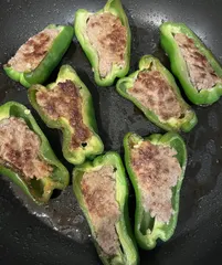 柚子胡椒ピー肉🫑 鶏ミンチに柚子胡椒を混ぜて、今回はピーマンに詰め詰め‥🫑 いい焼き色がつきました🎵