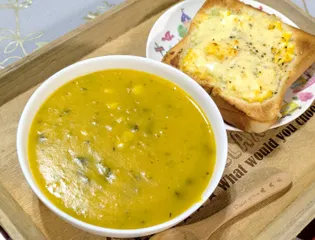 🎃かぼちゃスープを朝食に🌞 🎃かぼちゃスープを朝食に🌞 かぼちゃの皮も使って、かぼちゃスープを作りました。トーストは、ゆで卵にとろけるチーズ&マヨネーズ、そこにブラックペッパーを添えました♪ イエロー色強めな食事になってしまいました(笑)