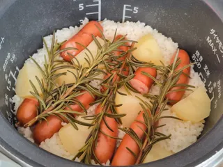 庭で摘んだローズマリーとジャガイモ、ソーセージにオリーブオイルで炊き込みご飯にしてみました!最後にブラックペッパーをかけて出来上がりです。おとなし目の味になっています。バターや醤油などを追加しても良かったかも!