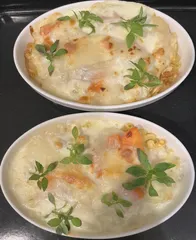 シチューをグラタンに❤️ マカロニをゆがいて、シチューとチーズをかけてオーブンへ♨️ 仕上げはトッピングバジル🌿✨✨熱々で美味しくできたよ〜!!