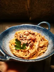 ボロネーゼ?ミートソース? 今だに違いがはっきりしません…素材も調理方法も同じ?? オリーブオイル(米油などでも)にんにく→玉ねぎ(みじん切りでソフリットを作る(お好みでセロリのみじん切り足しもあり細かい泡が出てきたら挽肉投入(ナツメグを混ぜて(予め小さなボール状にして(焼きめ付けと肉汁水分閉じ込め香ばしい香りがして