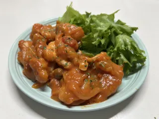 チキンのトマト煮 チキンときのこ、玉ねぎを炒めて、ホールトマトで煮込みました。大好きなローリエ、ガーリックも一緒に仕上げはパセリ〜彩り良くなりました