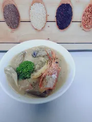 💠牡蠣と海老の豆乳シチュー 💠牡蠣と海老の豆乳シチュー 昨日のシチューの(ニューイングランドクラムチャウダーの事ですが、編集に手間取り投稿が遅くなりました😥)具材を半分取り分けておいたので、牡蠣とにんにくの芽をハーブオイルと🍋で漬け込んだパックを見つけ、有頭海老と一緒に煮込んで豆乳クリームシチューを作りました&nbs