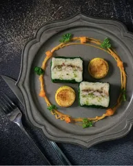 秋刀魚とジャガイモのテリーヌ 長芋のターメリックソテーと炙りチーズ 柿とシナモンのソース 秋刀魚を使ってテリーヌを作りました🐟 秋刀魚はグリルで焼いて身をほぐし、ヨーグルトで作った軽いポテトサラダと層にして周りにはさっと茹でた小松菜の葉を巻きました。仕上げにスダチの皮を削っています👩🏻🍳テリーヌの横には丸くくり抜いた長芋をターメリックでソテーし黄色く色づけ、上にこちらも丸くく