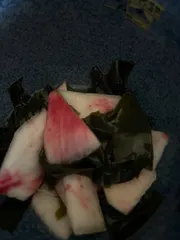 カブ もものすけという品種のサラダにぴったりな柔らかい赤カブとわかめをポン酢と和えてさっぱりした副菜を作りました🥰