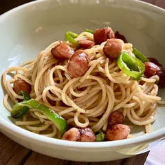 ソーセージとにんにくのピリ辛野郎パスタ ■材料パスタ・・・100gソーセージ・・・3本ピーマン・・・1個ひまわり油・・・適宜にんにくチューブ(S&B)・・・お好きなだけS&B チリペッパー・・・少々A:S&B ブラックペッパー・・・少々A:塩・・・少々A:S&B 辣油・・・少々 ■作り方【1】フラ