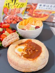 もう何年もなん度もリピートして作ってるカレーパン揚げカレーパンは苦手なので焼きが1番好きです😍 ディップは手軽だけど、今回はうずらの卵を少し加熱させたくてイングリッシュマフィンをくり抜いて器にした可愛いバージョン 1枚半くり抜いて、「栗原はるみわたしのカレー」で調理したカレーをi