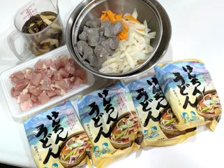 冷凍の具材を利用して簡単で美味しい「けんちんうどん」ができました。 「モチモチしたうどん」と冷凍の鶏団子、椎茸、ブロッコリーの組み合わせは、とても食べ応えがありました。 以前から食べてみたかった「けんちんうどん」は購入した福袋に入っていました。出汁の香りと味が本当によかったです。