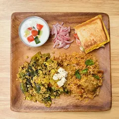 春キャベツキーマ 今日はお出かけなので朝カレーにしました。スパイスたっぷりですがキャベツ半玉(!)も入ってて、優しいキーマカレーです。話題になった無印良品の冷凍ビリヤニとライタ、紫玉ねぎの簡単アチャール、先週あたりからハマってるワンパンホットサンドと一緒に。朝から食べすぎましたw