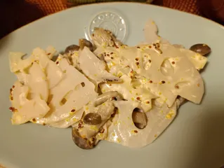 菊芋をシャキシャキサラダで。菊芋を千切りにして水にさらし、水を切る。カニカマをほぐす。ボールにマヨネーズ、からし、ポン酢にバルサミコ酢をちょっと。ぐるぐる混ぜ、菊芋とカニカマもいれて合わせたものを、レタスを敷いた器の上に盛り付けて完成!菊芋のシャキシャキした食感はとても良いです。サラダのドレッシング