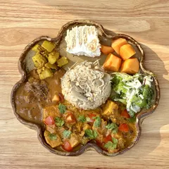 メインのカレーは人気店「魯珈」さんのレシピで、ワイルドカルダモンを使っています。ごはんはしらすとごぼうの炊き込み、左は黒毛和牛&クリームチーズのカレー(レトルト)。青パパイヤのアチャール、柿、チャービルのサラダを添えました。上のデザートはヨーグルトとココナッツサブレで錬成したチーズケーキ!(SNSで