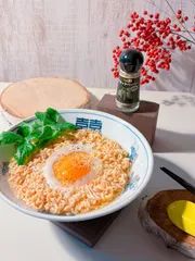 黄色い鳥のキャラクターのメーカーでは無い、チキンのラーメン。お湯を入れて待つだけの粉末スープも無い。非常に酷似した商品を食べました。テーブルコショーでは弱いかな?と思い、「ブラックペッパー」にしたら大正解٩(๑❛ᴗ❛๑)۶パンチが効いて🤜美味しい〜あ、卵があるからかも?粉チーズもかけて食べました。葉