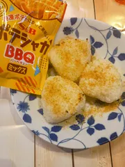 ポテシャカ焼きおにぎり 明日の朝ご飯に焼きおにぎりを焼いて。ポテシャカBBQミックスをかけました。多分美味しい😋明朝まで待てない。指に付いたポテシャカの粉が馬🐴い。
