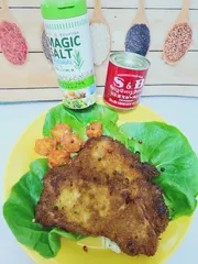 💠カレー風味のとんかつ 豚ロース肉をカレー粉を付けてとんかつにしました〜♪豚肉の筋切りをしてマジックソルトで下味を付けて小麦粉、赤缶カレー粉、パセリ卵1個を水と小麦粉を混ぜてパン粉を付けてフライパンに油を2cmくらい入れてカラッと揚げる 出来上がったとんかつは、いつものお肉よりも
