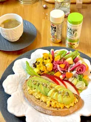 お手軽なオープンサンドイッチ かぼちゃサラダには「エスビー味付き塩こしょう」スクランブルエッグには、「マジックソルト」味付け考えなくても良いから楽ちんですね🙆 甘〜いかぼちゃだったので、塩胡椒多めに 次何作ろう↩️