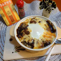 リメイクカレードリア 先日のカレーのリメイクです。舞茸のみじん切りを塩胡椒を入れた米油で炒め、雑穀米を加え、ガラムマサラとオールスパイスで味付け。具を細かく切ったカレー、チーズ、たまごをのせて、トースターでたまごが半熟になるまで焼きました。