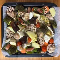 鶏肉、れんこん、じゃがいも、にんじん、ブロッコリー、なす、かぶ、さつま芋、ピーマン、えりんぎ、ミニトマト…にローズマリーをのっけてオーブンで焼きました♪お腹はすいてるけど調理する元気がない時によく作る、切って並べたらオーブン任せの楽ちんぎゅうぎゅう焼きなんですが、ローズマリーの香りがごちそう過ぎて手