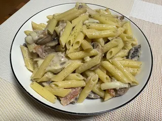 昨日はペペロンチーノだったので、今日は牛乳とチーズでクリーム系にしてみました。マッシュルームとベーコンのペンネです。味付けは昨日と同じ、マジックソルトです(・0・)ゞ