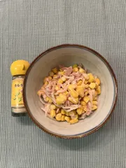 パウチのミックスビーンズ、コーン、ツナにサーモンハラス(ふるさと納税返礼品)をトッピングした、簡単お手軽な一品