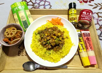 春をイメージし✿私なりに華やかに~🌈 本日の夕食はちょっぴり春🌸を意識して…私なりですが(笑) 華やかな色どりを意識してみました🌈【ドライカレー&ターメリックライス】ドライカレーの具材は、豚ひき肉・大根・コーン・枝豆味付けは初めて🔰赤缶カレー粉を使用しましたヽ(^o^)丿コンソメ・ケチャップ・ソース・生姜・にんにくで味を調整しました♪盛
