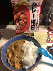 カレー曜日🍛🥄🌟 カレー曜日はすごいです😲なんとレンジで一発!ラクチン調理🍛✨️「中辛」ですがフルーティーでむしろチョッピリ甘さも感じるちびっ子からも愛される味です😋🍛”(カライのが得意じゃないムスメも「これ美味しい☺️!」言いながらペロリでした)具材もゴロゴロたくさん!🥔🥕日曜のお昼にのんびり食べたくなる、そんな優